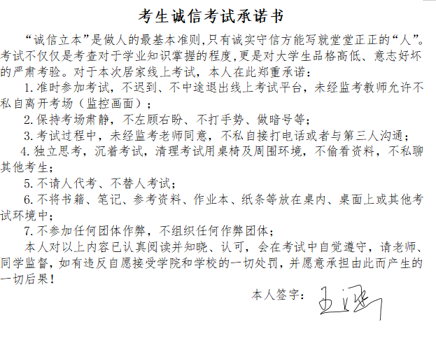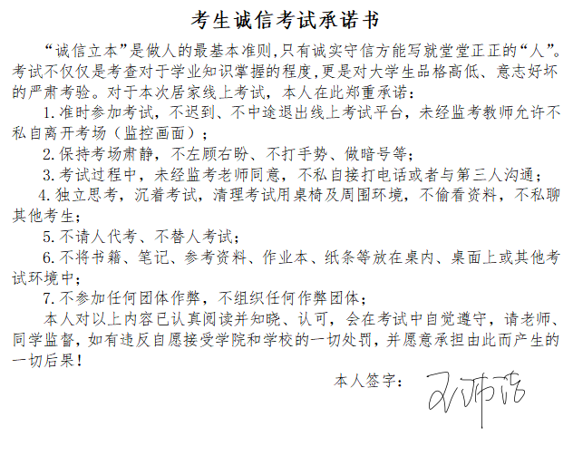 6月20日,milan米兰官网组织全体学生共同签署《诚信考试承诺书》,让同学们明确学校考试的规章制度,让学生们自觉遵守线上考试相关规定。