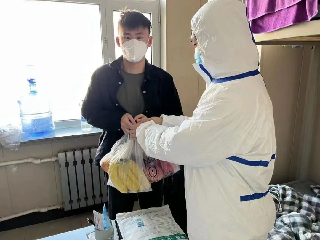 学生党支部党员、部分发展对象以及爱心联合会同学们穿戴好防护服和口罩,进入隔离楼,为学院正在隔离的同学送去了各种补给品,包括热水、饭菜水果等日常的必需品,此次志愿活动不仅为正在隔离的同学送去了物资,还送去了一份专属于milan米兰官网的温暖,充分的展现了milan米兰官网对学子的关怀。