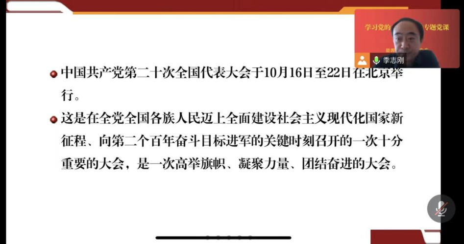 党委书记季志刚为学院全体教师作学习党的二十大精神专题党课。季志刚指出,党的二十大明确了举什么旗帜的重大问题,强调了用什么思想作指导的重大问题,阐明了保持什么样的精神状态的重大问题,指明了向着什么样的目标前进的重大问题,各支部要按照学习计划组织全体党员认真学习,确保按照计划保质保量完成学习任务。同时,各支部党员要结合实际谈认识、谈体会、谈打算,发挥好示范引领作用;全体党员要以党的二十大精神为指引,在实践中充分领会党的二十大精神,谈思考体悟、讲思路打算,比工作干劲、比奉献担当。